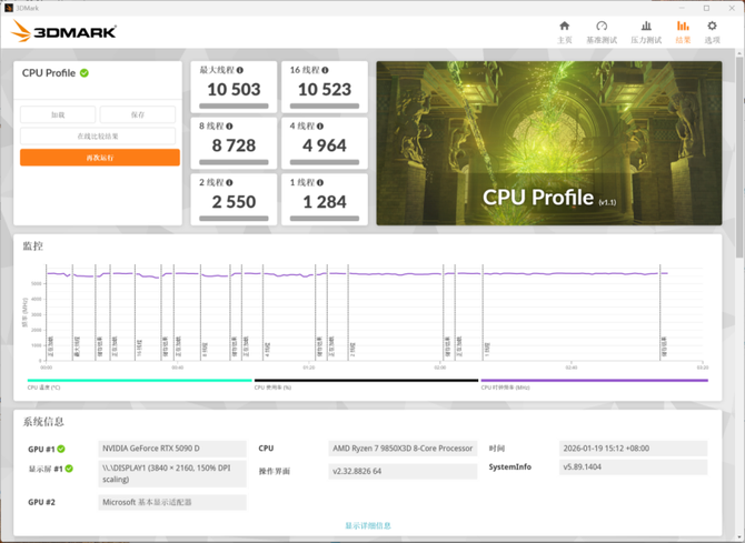 3DMARK测试中,可以看到9850X3D的单线程跑分为1284,最大线程的分数10503。