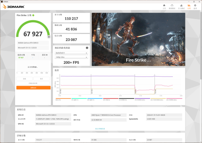 3DMARK FireStrike测试项目中,可以看到AMD锐龙7 9850X3D的物理分数为41836.