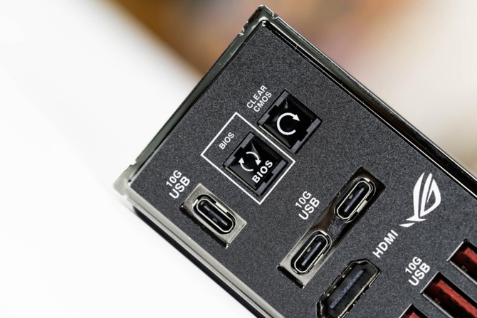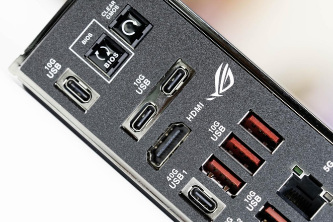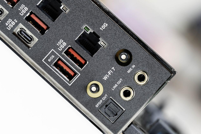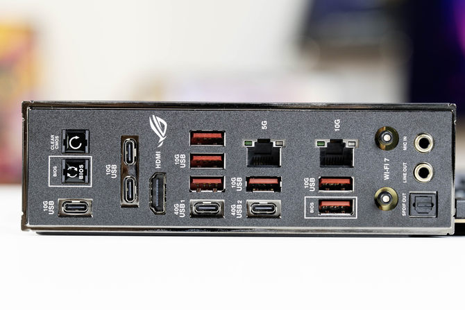 I/O区域接口方面,ROG X870E DARK HERO主板也是非常全面,题哦给你了3个USB-C 10Gbps接口,2个USB-C 40Gbps接口,支持视频输出,6个USB-A 10Gbps接口,两个网口,一个5G、一个10G,另外还有WiFi 7直插天线,整体接口配置非常夯,基本上是大满配。