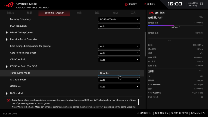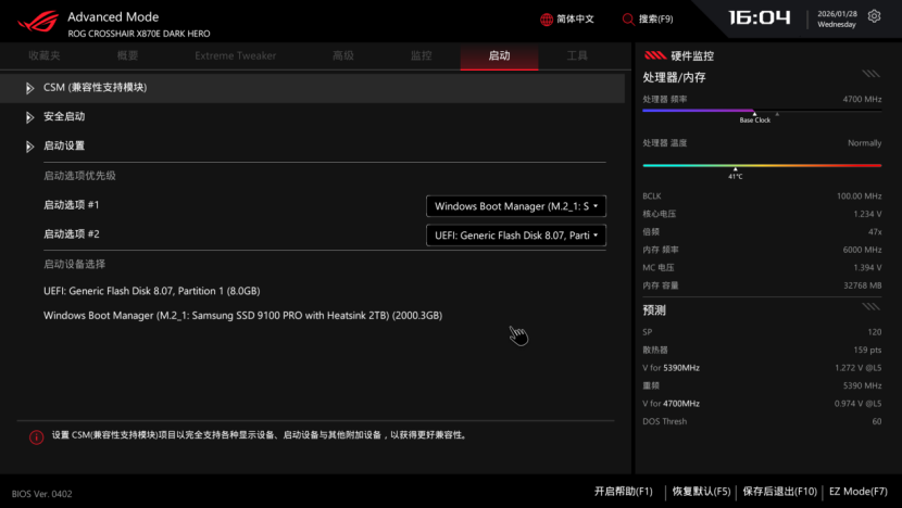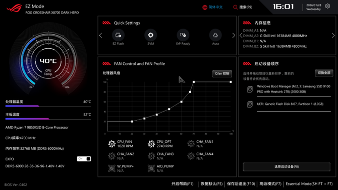 BIOS部分的话,在EZ模式下,延续了华硕简洁的可视化风格,并且左侧的电竞仪表盘设计带来出色的电竞氛围,并且对于硬件的运行状态也一目了然。