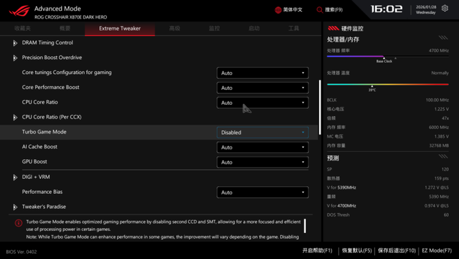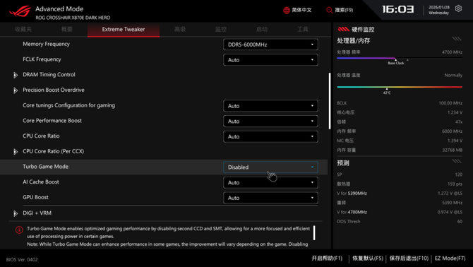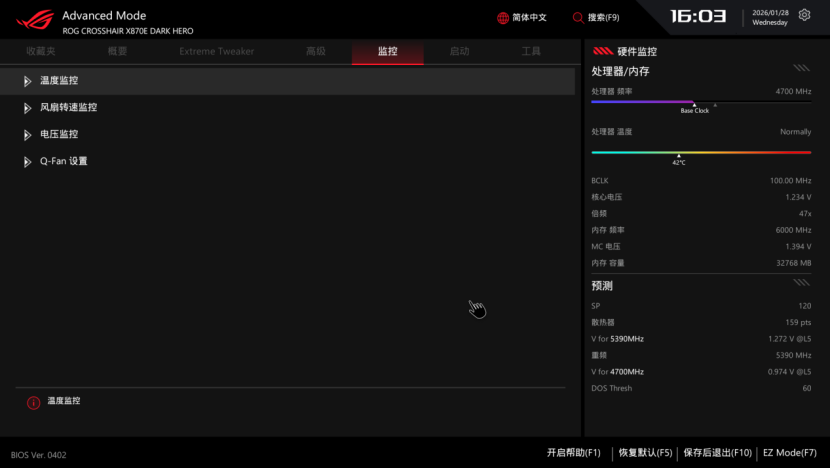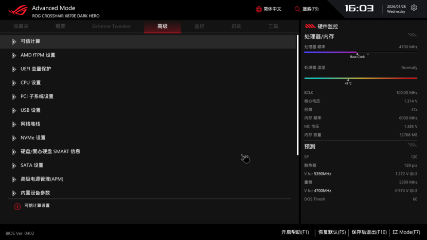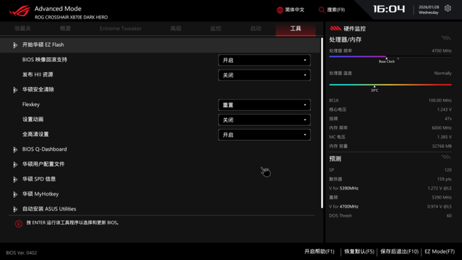 其他实用的功能方面,这次ROG X870E DARK HERO主板都有配备,满足广大用户的功能和个性化需要,不论是新手还是极限超频玩家,ROG的BIOS都能很好地满足大家的需求。