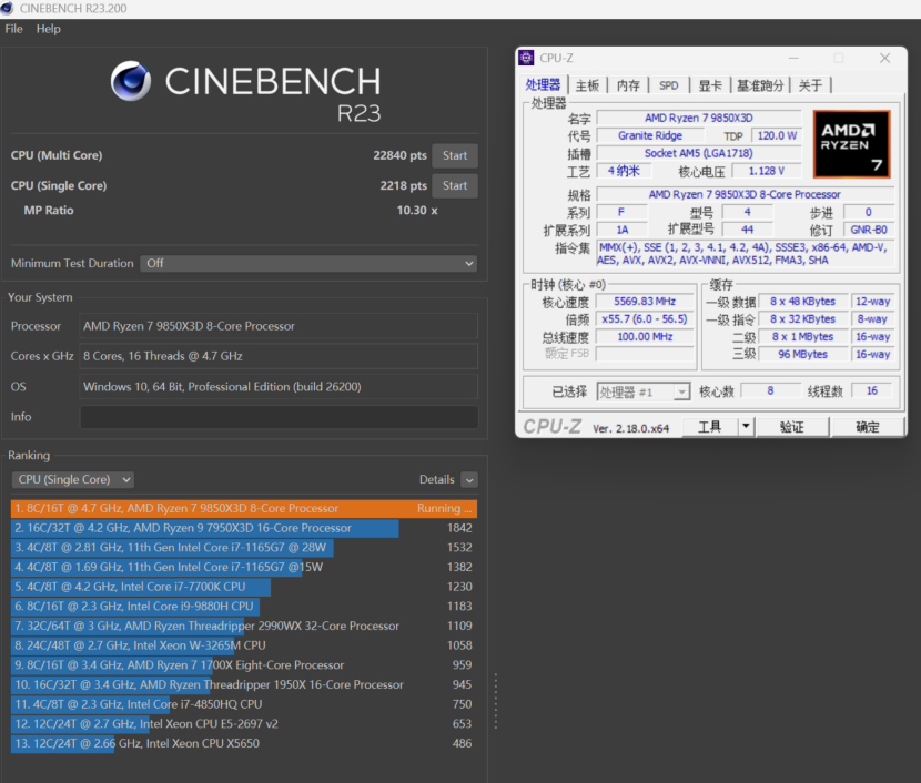 这次我们使用了全新一代的AMD锐龙7 9850X3D处理器,这款处理器采用了Zen5架构,4nm工艺制程,并且内置了AMD第二代3D V-Cache技术,缓存共计104MB,同时相对于AMD锐龙7 9800X3D在主频上从5.2GHz提升到了5.7GHz,在游戏方面的表现极为出色,是目前现阶段最强的游戏处理器。