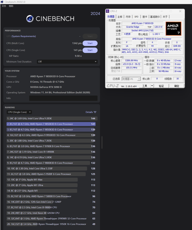 CINEBENCH 2024的多核心分数为1342,单核心分数为141,单核心的性能已经超过了旗舰级的9950X3D。