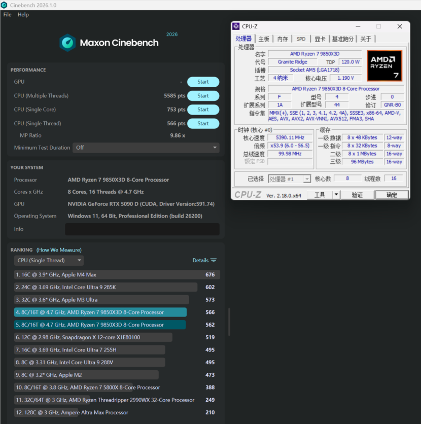 CINEBENCH 2026的多线程性能为5585,单核心性能为753,单线程性能为566,单位同样为pts。