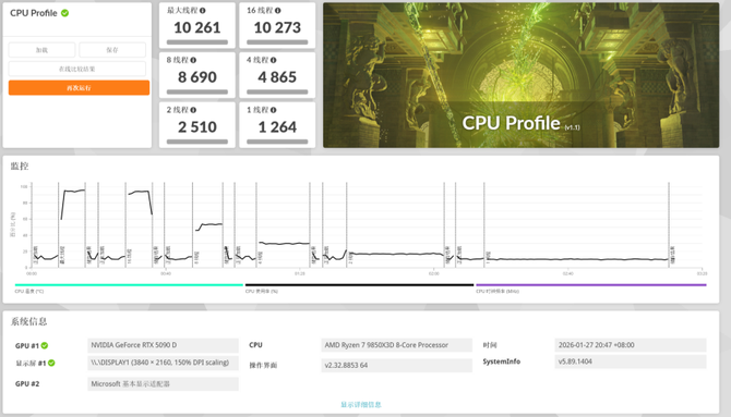 3DMARK的CPU Profile的单线程得分为1264,最大线程得分为10261。