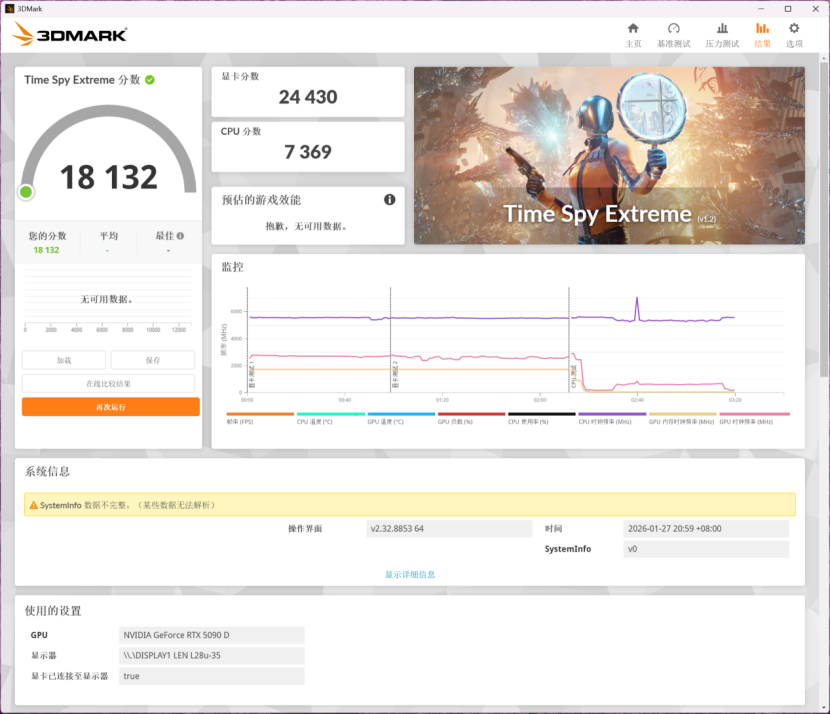 Timespy Extreme综合分数为18132,CPU物理分数为7369。