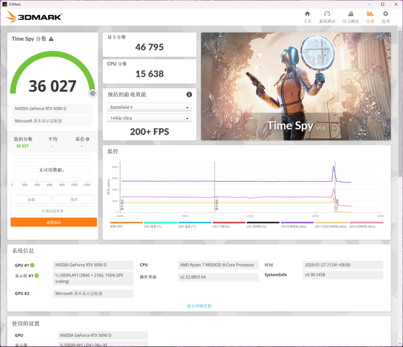 TimeSpy的综合得分为36027,CPU分数为15638,能够轻松运行各类DX12的3A游戏大作。