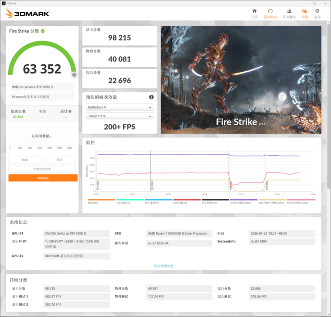 FireStrike是测量DX11游戏的性能表现的基准测试,对应的是1080P、2K和4K分辨率,对于CPU分数的考量没有太大的区别,在FS这类测试中,ROG X870E DARK HERO主板能够完发挥AMD锐龙7 9850X3D的全部性能。