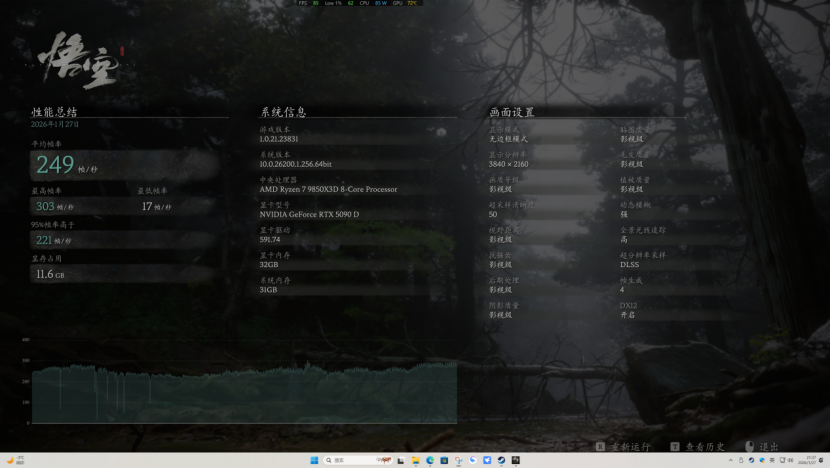 《黑神话:悟空》在4K分辨率,DLSS质量的情况下,游戏的帧数为249,游戏性能表现非常出色。