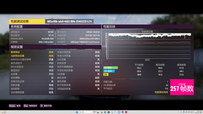 4K分辨率下,《地平线5》的测试成绩为257FPS,平均帧数优秀。