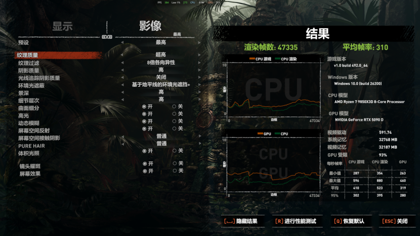 《古墓丽影:暗影》的游戏帧数为310FPS,4K分辨率下依旧能够高帧数运行,游戏表现优秀。