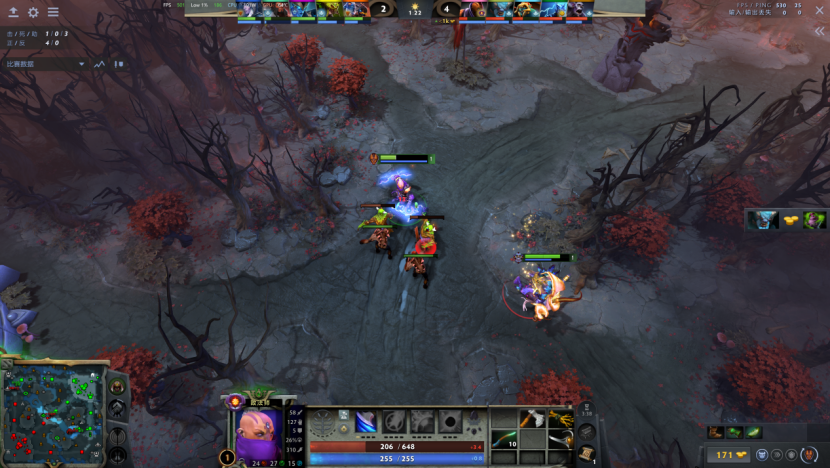 DOTA2的4K分辨率下,对线期的游戏帧数在500FPS左右,游戏性能稳定出色。