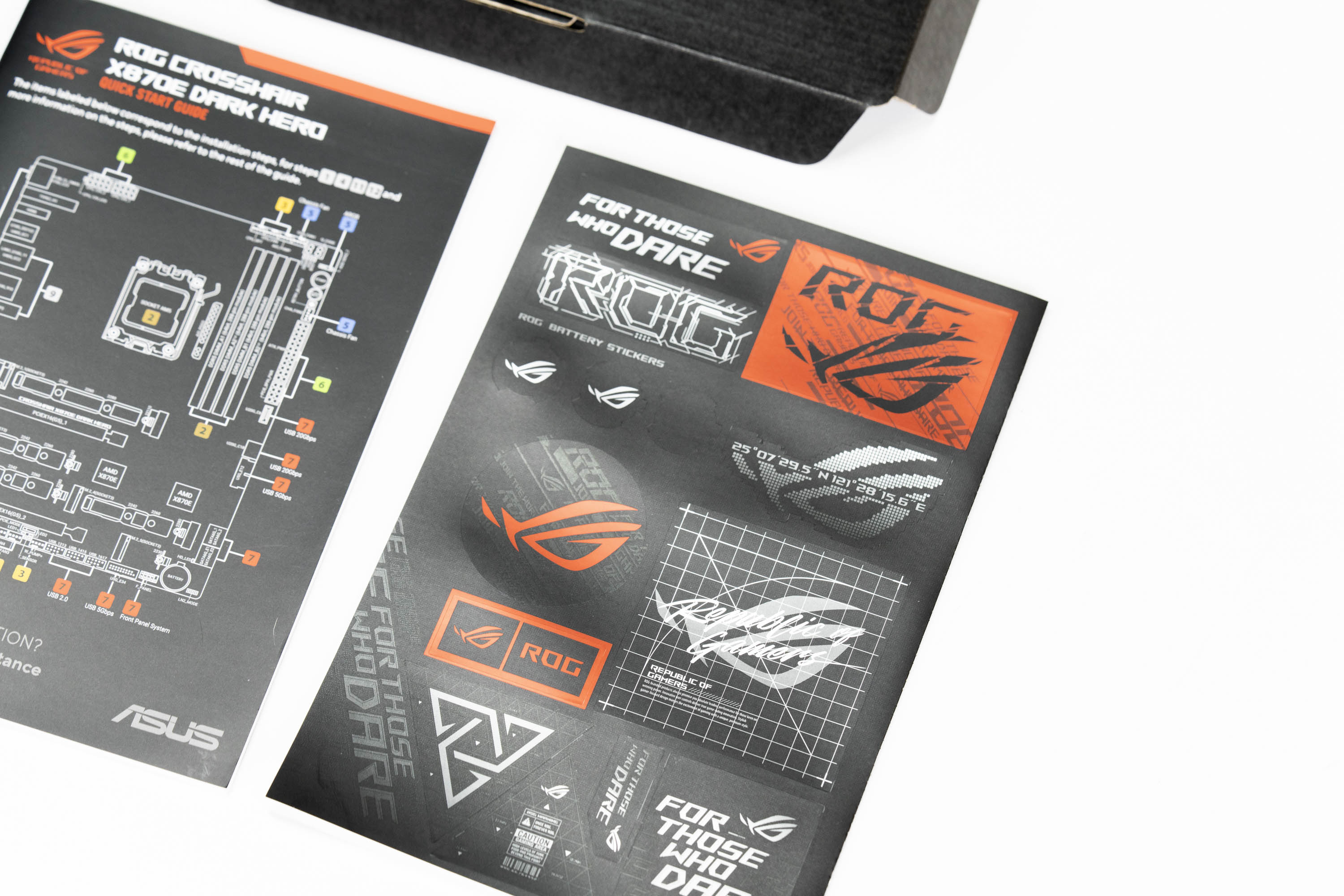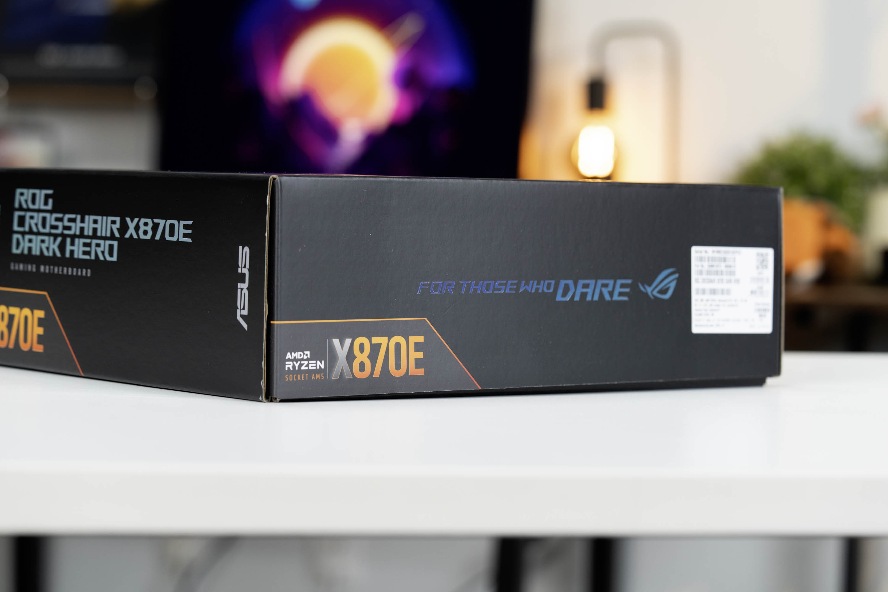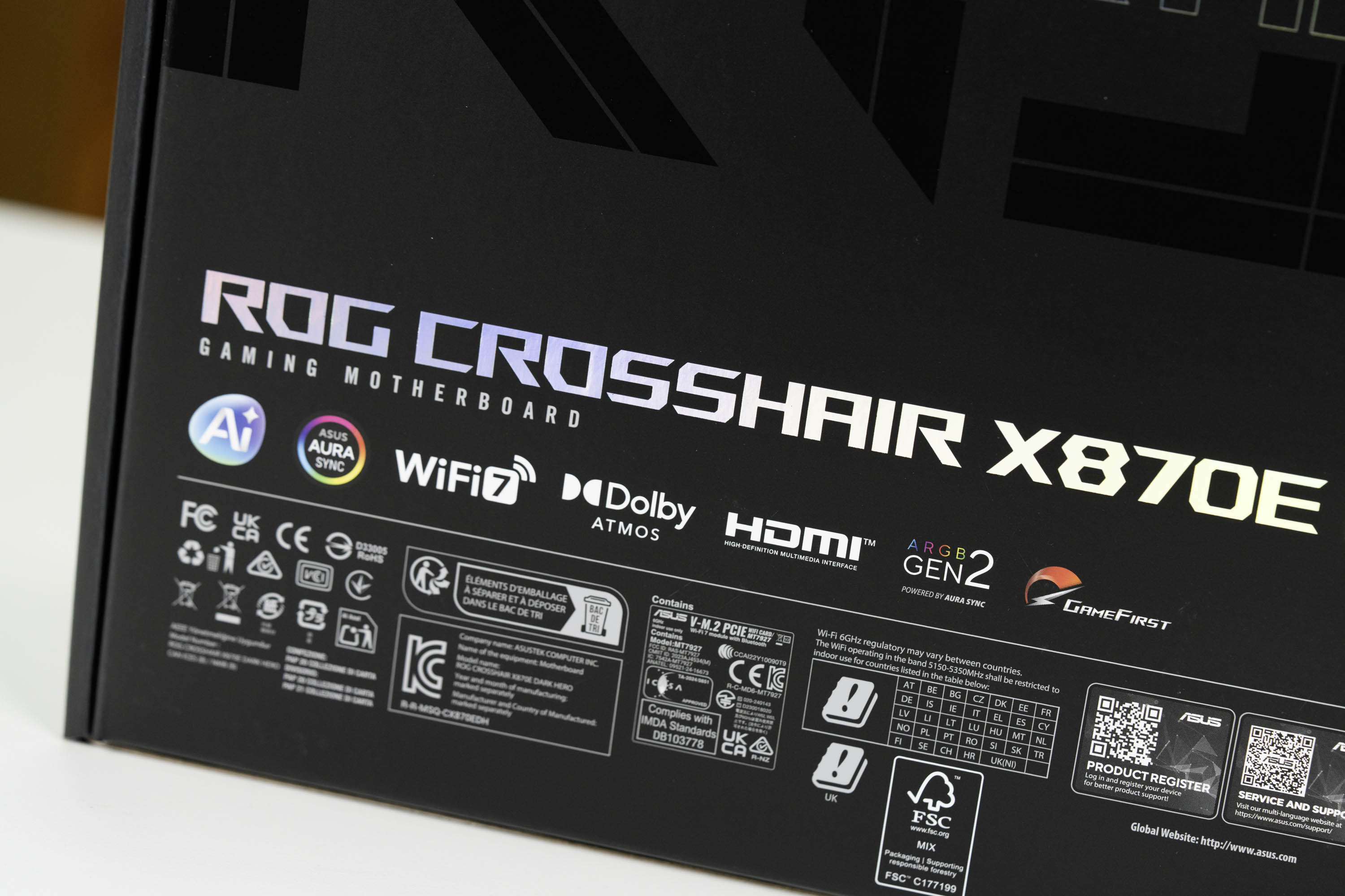 包装的背面是主板的关键技术特性和各类认证,侧面是“FOR THOSE WHO DARE”的品牌宣传标语以及AMD的X870E芯片组标志。