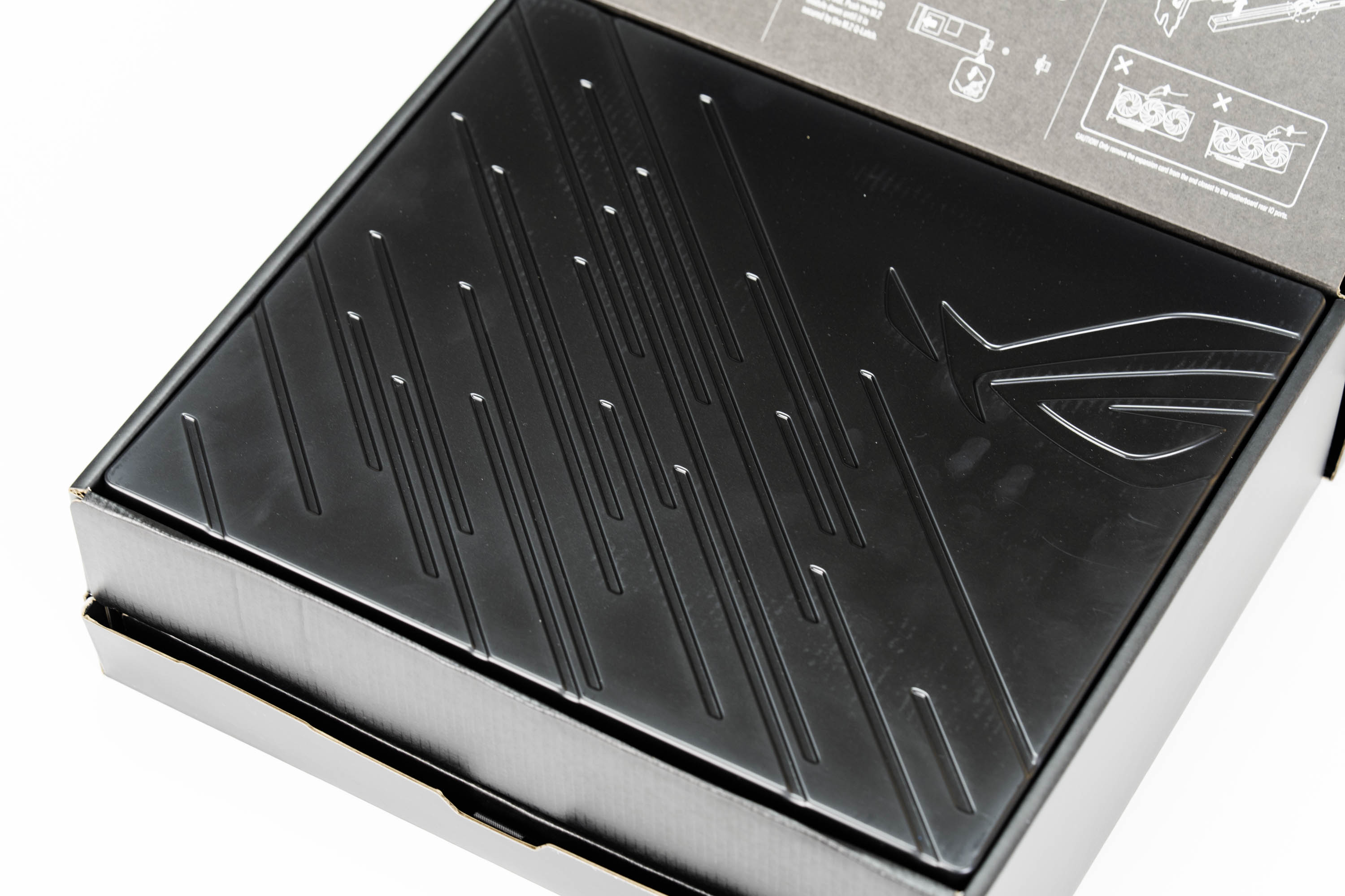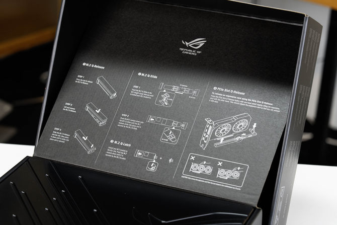 打开主板包装之后,顶部绘制了M.2硬盘散热装甲快拆和安装操作的讲解和显卡PCIe快拆方式,下半部分则是黑色的主板防尘盖。