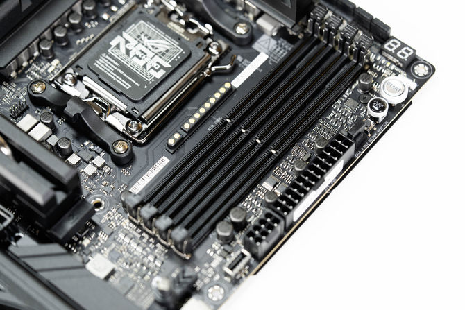 内存的话,ROG X870E DARK HERO提供了4条DDR5内存插槽,支持最高256G容量的内存,单根内存容量支持64GB,在频率方面,配合上ROG的NitroPath内存优化和内存超频黑科技,支持最高9200MT/s的超高频率,对于高阶游戏玩家来讲,高频内存可以带来更高的游戏帧数。