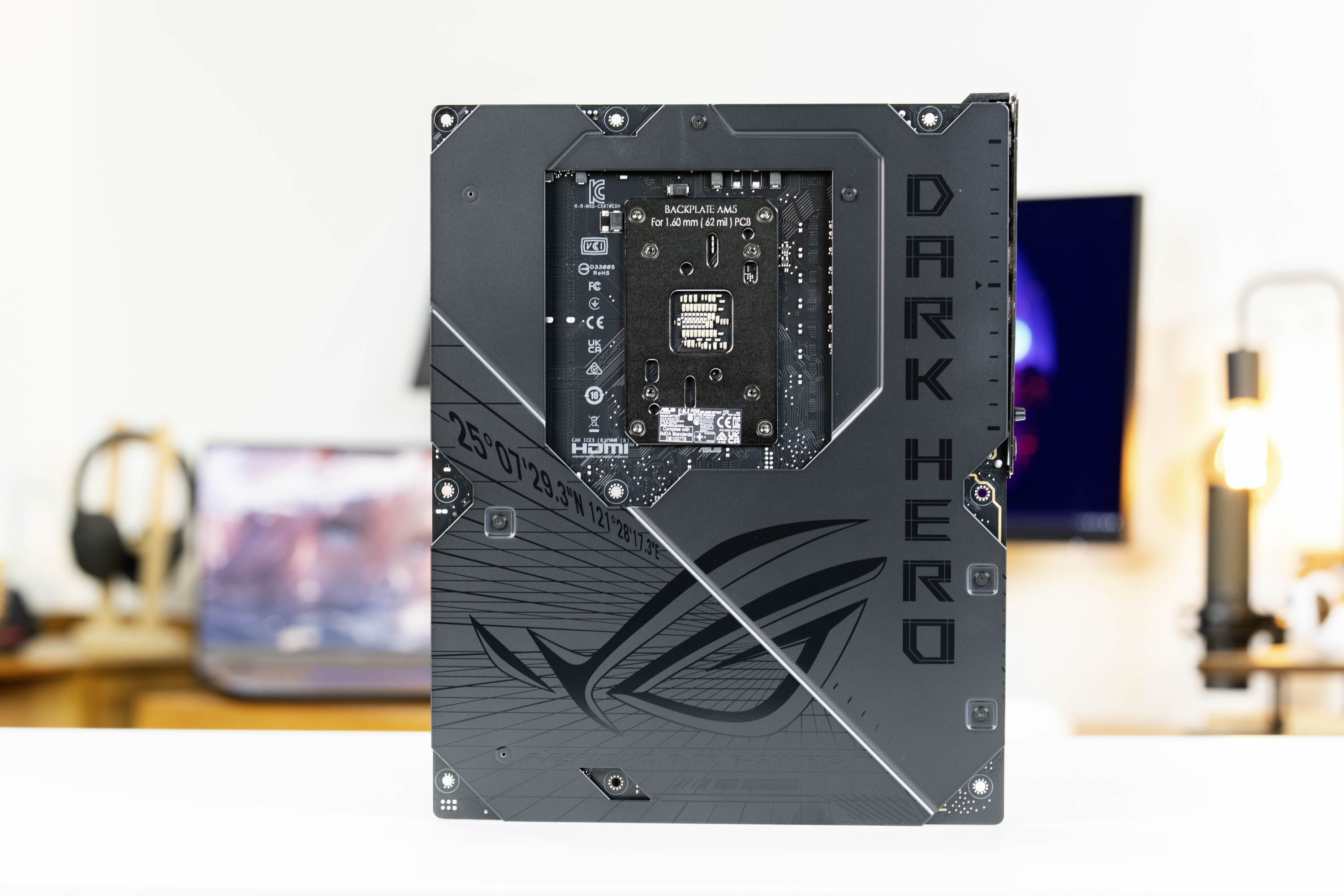 另外主板的背面也完全是被全金属的装甲覆盖,并且还有信仰之眼的LOGO,做工和用料非常扎实,旗舰属性非常突出。