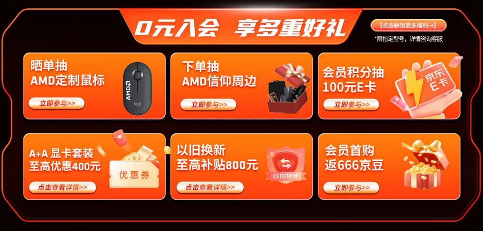 先来看一下目前购买AMD 锐龙7 9850X3D处理器有哪些首发活动,还是建议大家成为AMD京东自营旗舰店的会员,加入会员之后就可以解锁一系列的福利了,会员首购返666京豆,以旧换新至高补贴800元。CPU新品晒单送AMD定制鼠标,A+A显卡套装至高优惠400元,下单还可以抽AMD信仰周边,获得的会员积分还能抽100元京东E卡。目前现货发售的活动和预售期的活动差别不太大,福利满满大家可以放心冲,下面就来详细介绍锐龙7 9850X3D。