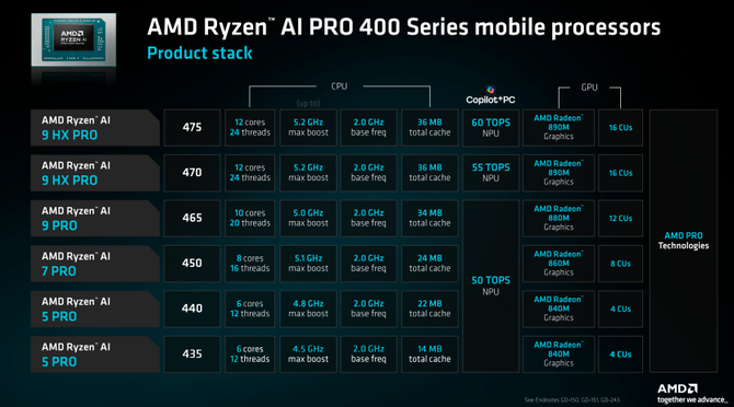 首先是移动端,这次一共发布了6款型号,规格从6核心12线程到12核心24线程,型号从“435”到“475”并且至高可选搭载了16Cus的AMD Redeon 890M核显,另外至高还可选60TOPS算力的NPU,满足微软Copilot+PC的要求。