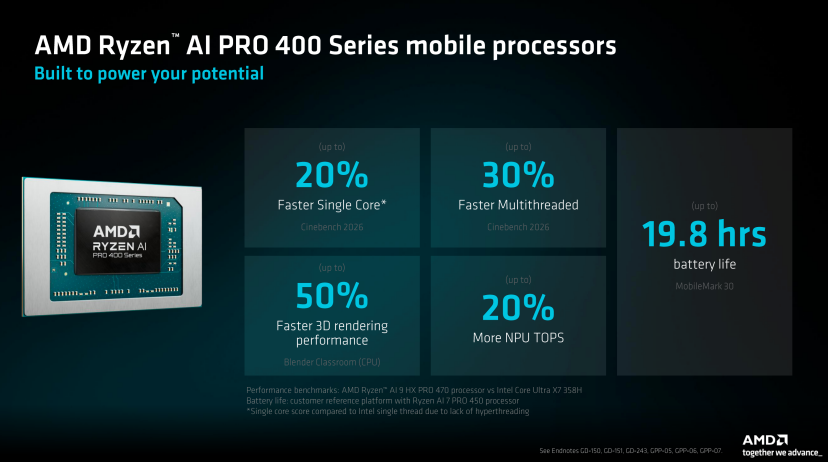 根据官方的资料显示,AMD锐龙AI 9 HX 470型号相对于英特尔酷睿Ultra X7 358H型号处理器,可以实现至高19.8小时的电池续航,20%的单核心性能,30%的多线程性能,50%的3D渲染能力,和20%的NPU算力。