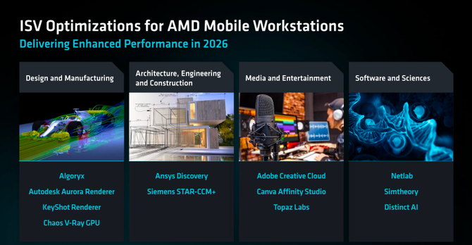 除了硬件的规格更强之外,AMD在ISV的支持上同样亮眼,针对目前市面上主流的建模、渲染和后期软件,都能轻松应对,满足移动工作站的性能要求。