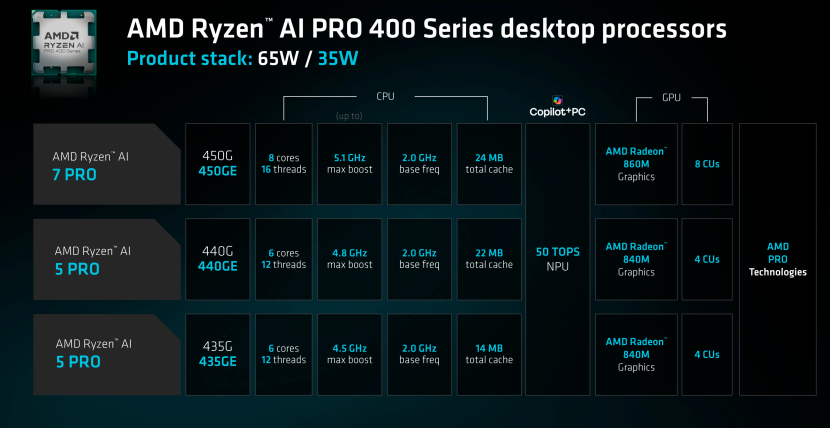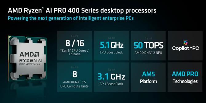 这次AMD还发布了针对桌面端的台式机锐龙AI PRO 400系列处理器,至高搭配8核心16线程,采用AM5接口,并且还内置了50TOPS的NPU单元。