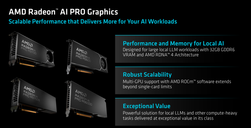另外针对服务器用户来讲,AMD还有Radeon PRO R9000系列显卡专业显卡,针对服务器用户推出,适合AI开发者或者工作站用户使用。