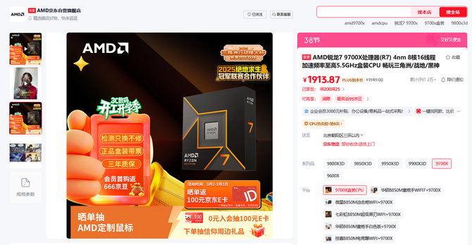 目前AMD 锐龙7 9700X处理器在在京东自营旗舰店的最新报价是1949元,PLUS会员满减后到手低至1913.87元,成为AMD京东自营旗舰店会员还有0元入会抽100元E卡,首购返666京豆和晒单抽AMD定制鼠标等活动。目前AMD 锐龙7 9700X处理器的售价属于近期低价了,对于节后攒机2K预算买CPU的DIY用户来说这款就是更加优质的选择,拥有全方位更好的体验。