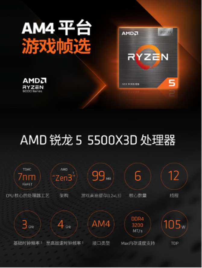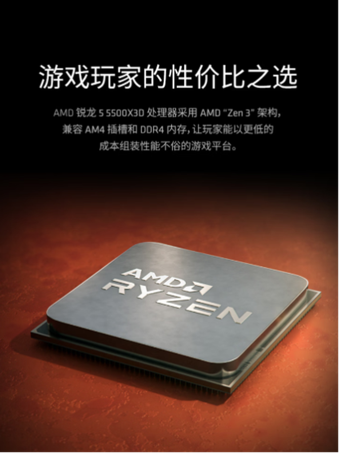 AMD 锐龙5 5500X3D处理器是近期刚刚上市开卖的新品,但熟悉CPU市场的用户对它并不陌生,作为AMD X3D家族的“入门担当”,锐龙5 5500X3D首次将旗舰级3D V-Cache技术下放至千元价位,其核心配置堪称“越级打击”,所以用它打造高性价比整机可不是说说而已,下面为大家详细来介绍一下。