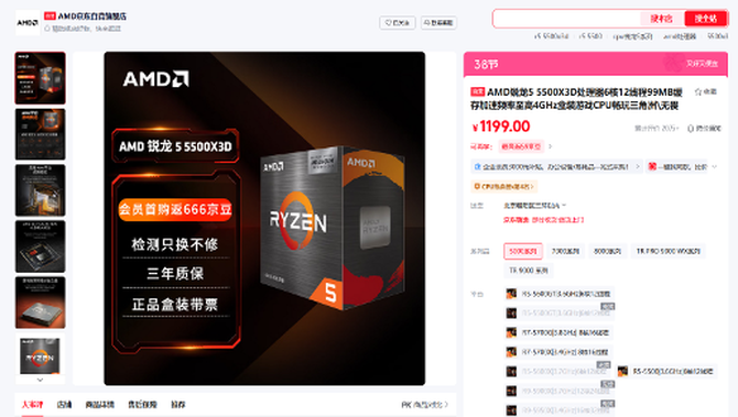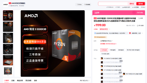 AMD 锐龙5 5500X3D处理器在AMD京东自营旗舰店的首发价格只要1199元,成为京东旗舰店会员还有0元入会抽100元E卡,首购返666京豆等活动。这样的首发价格,让锐龙5 5500X3D处理器成为AMD发售价最低的3D V-Cache处理器,也是当前千元级市场中最具竞争力的游戏处理器之一。