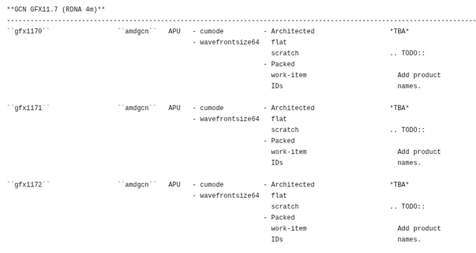 3 月 25 日消息,科技媒体 Phoronix 报道,在 AMD 开源图形栈的 LLVM 更新代码中,发现了 GFX1171 和 GFX1172 两个全新的图形目标代码。这两个新目标均被官方标记为 RDNA 4m 架构,与此前已曝光的 GFX1170 代码一同出现。