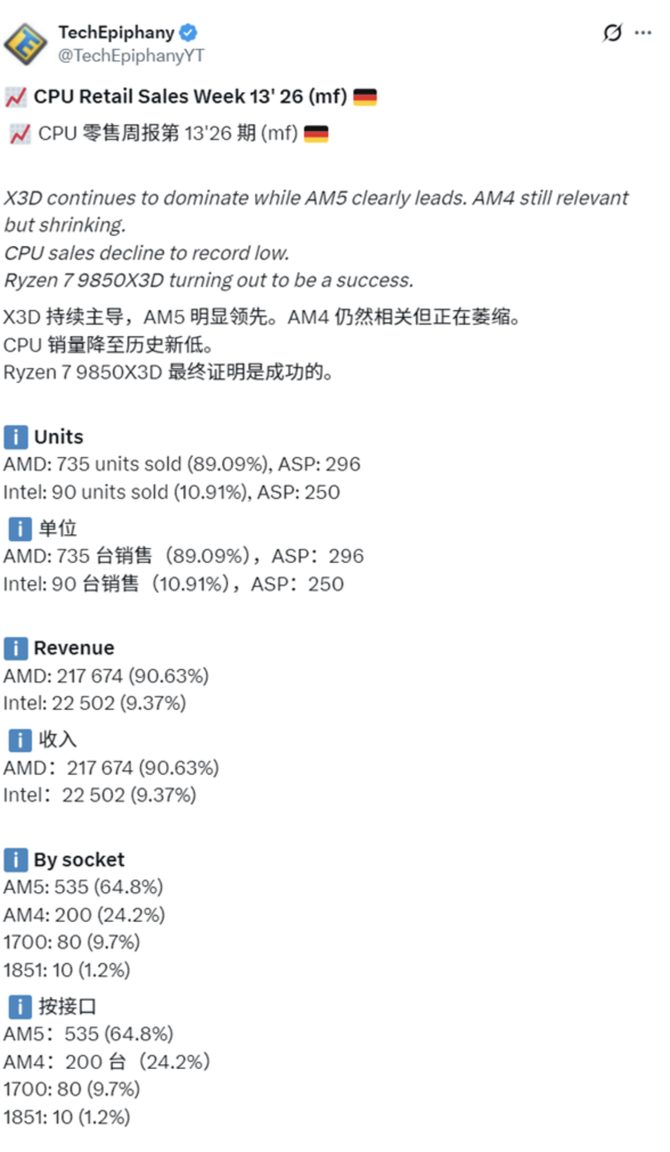 4月1日消息,据TechEpiphany分享的德国零售商Mindfactory最新CPU销售数据,2026年第13周的桌面处理器销量创下历史新低。