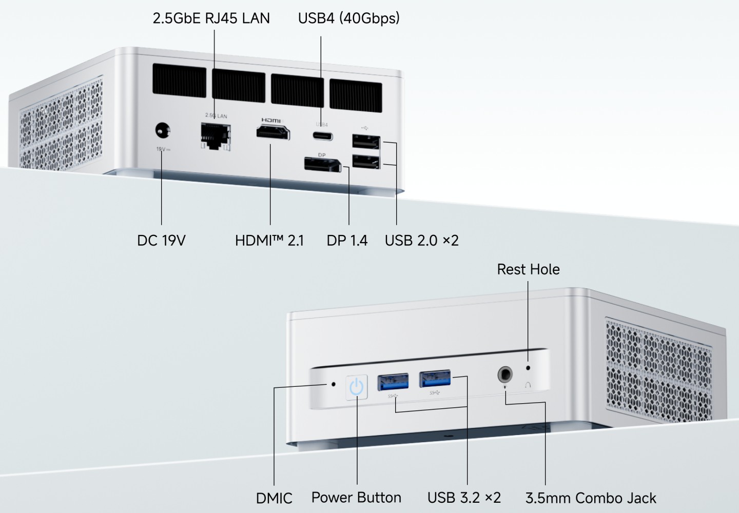 存储扩展方面,该迷你主机内置2个DDR5-5600 SO-DIMM内存插槽和2个M.2 2280 PCIe Gen4 SSD盘位,满足多样化存储需求。网络连接方面,配置英特尔I226-V有线网卡以及支持Wi-Fi 6E与蓝牙5.2的无线网卡。