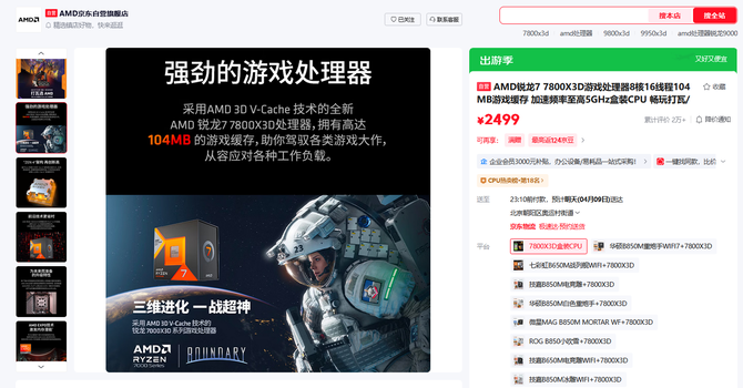 目前AMD 锐龙7 7800X3D处理器在京东自营旗舰店的最新报价是2499元,成为AMD京东自营旗舰店会员还有0元入会抽100元E卡,首购返666京豆和晒单抽AMD定制咖啡杯,加购商品送抽织带挂绳,下单抽AMD信仰周边礼品和冲榜抽电动螺丝刀等活动。准备迎接每一次竞技网游重大更新的DIY玩家们,推荐直接下单AMD锐龙7 7800X3D+24GB内存这一组合,让你可以一键开启最重要的“物理外挂”。而对于追求质价比的DIY玩家而言,AMD 锐龙7 7800X3D处理器不挑内存的特质,可以让大家在预算有限的情况下,仍能享受流畅游戏体验,从而轻松战未来。