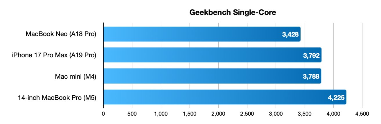 核心策略是复用 iPhone 17 Pro 系列上的 A19 Pro 芯片,搭配 12GB 内存。Geekbench 测试数据显示 MacBook Neo 单核得分与 iPhone 17 Pro Max 及现款 Mac mini 差距在 10% 左右,但多核得分远低于 Mac mini,意味着在视频编辑等重负载场景下会力不从心。