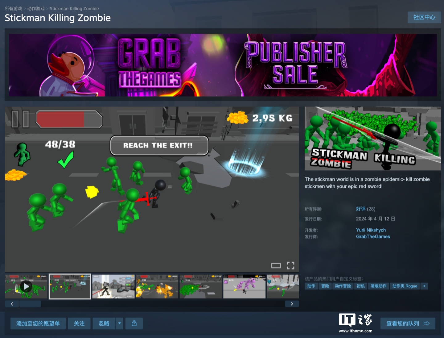 4月17日消息,独立开发者打造的火柴人动作砍杀游戏 Stickman Killing Zombie 在 Steam 平台开启限时免费领取活动。该游戏国区原价 15 元,玩家可在 4 月 20 日凌晨 1 点前加入库存。