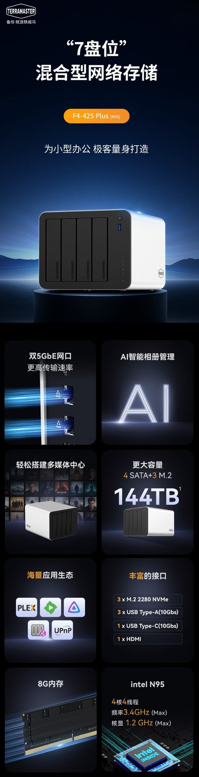 存储容量至高可达 144TB,网络方面配备 2 个 5GbE RJ45 接口,外部提供 3 个 USB-A 10Gbps、1 个 USB-C 10Gbps 和 1 个 HDMI。运行 TOS 6 操作系统,支持 Plex、Emby 和 Jellyfin。
