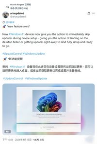 微软调整Windows更新策略,在Windows 11初始设置中新增“稍后更新”选项,允许用户跳过强制更新直接进入桌面,缩短设置时间。更新可延后至设备空闲时完成。该功能已向所有消费者设备默认启用,但企业环境仍由IT管理员控制。