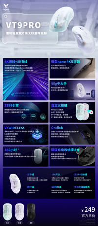 搭载着雷柏V+无线游戏技术,产品力、品牌力为一身的VT9PRO双高速双模版——拥有4K无线+8K有线电竞游戏技术,并使用了雷柏科技与原相科技共通校调的旗舰级原相定制3398光学引擎(3395高定版),通过升级驱动软件版本、鼠标本体以及接收器固件后,性能有所优化,同时可以开启11档静默高度驱动可选的功能。