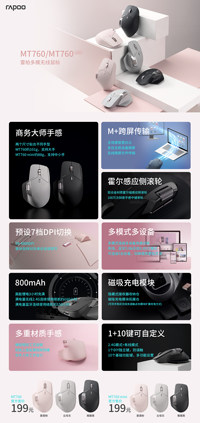 雷柏M+无线跨屏传输技术,产品力、品牌力,硬实力。霍尔磁感应侧滚轮呈现更精准平顺的滚动控制,100万次刻度手感铝合金中键滚轮,蓝牙5.0、无线2.4G和有线三模连接五台设备快速切换,7档实时调节DPI按键,并且通过驱动支持50为单位逐级调节。玩家可以通过驱动实现至高11个可自定义按键可编程,雷柏MT760多模无线鼠标,即刻开启无线跨屏的办公便利。