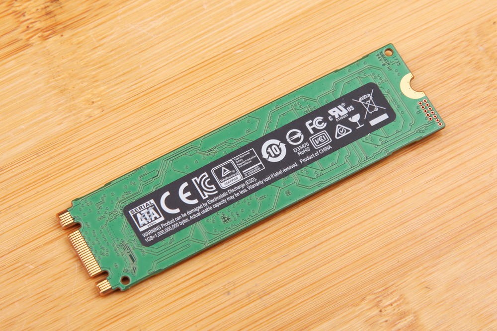接口为M.2的Socket 2(金手指有两个缺口),支持SATA和PCI-E 3.0×2两种通道,这块860 EVO走的是SATA通道,理论带宽6Gb/s。