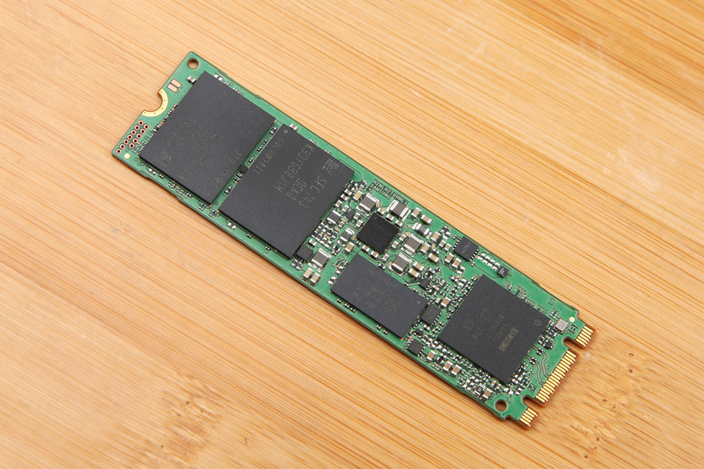 撕掉SSD正面的贴纸就可以看到所有的芯片了,PCB正面由一颗主控+一颗缓存+两颗闪存颗粒组成。