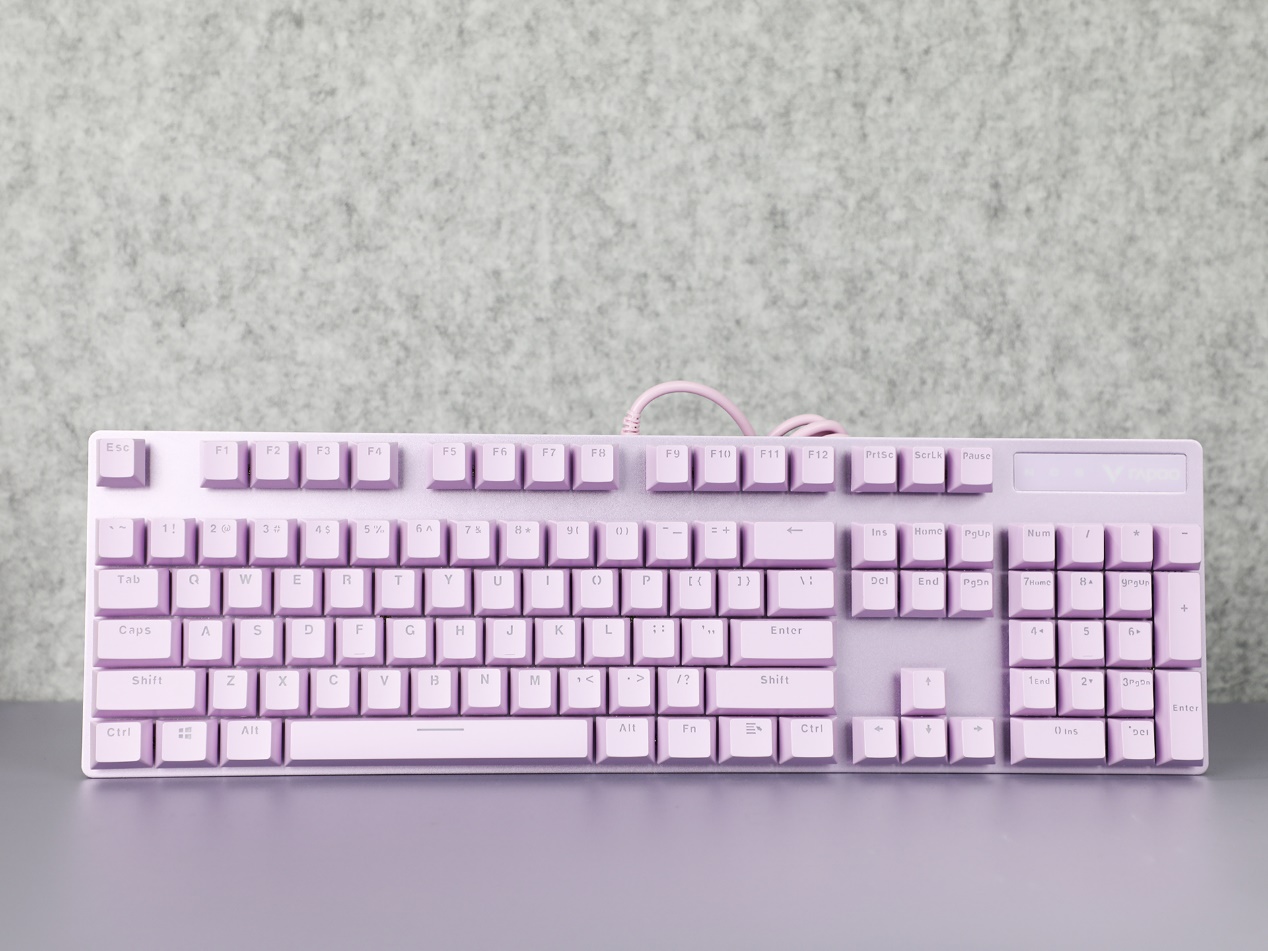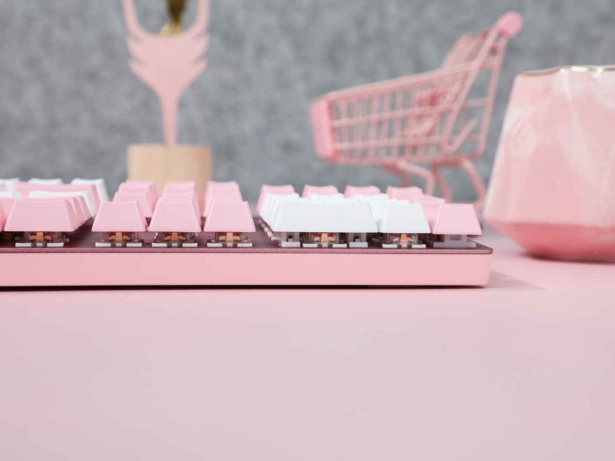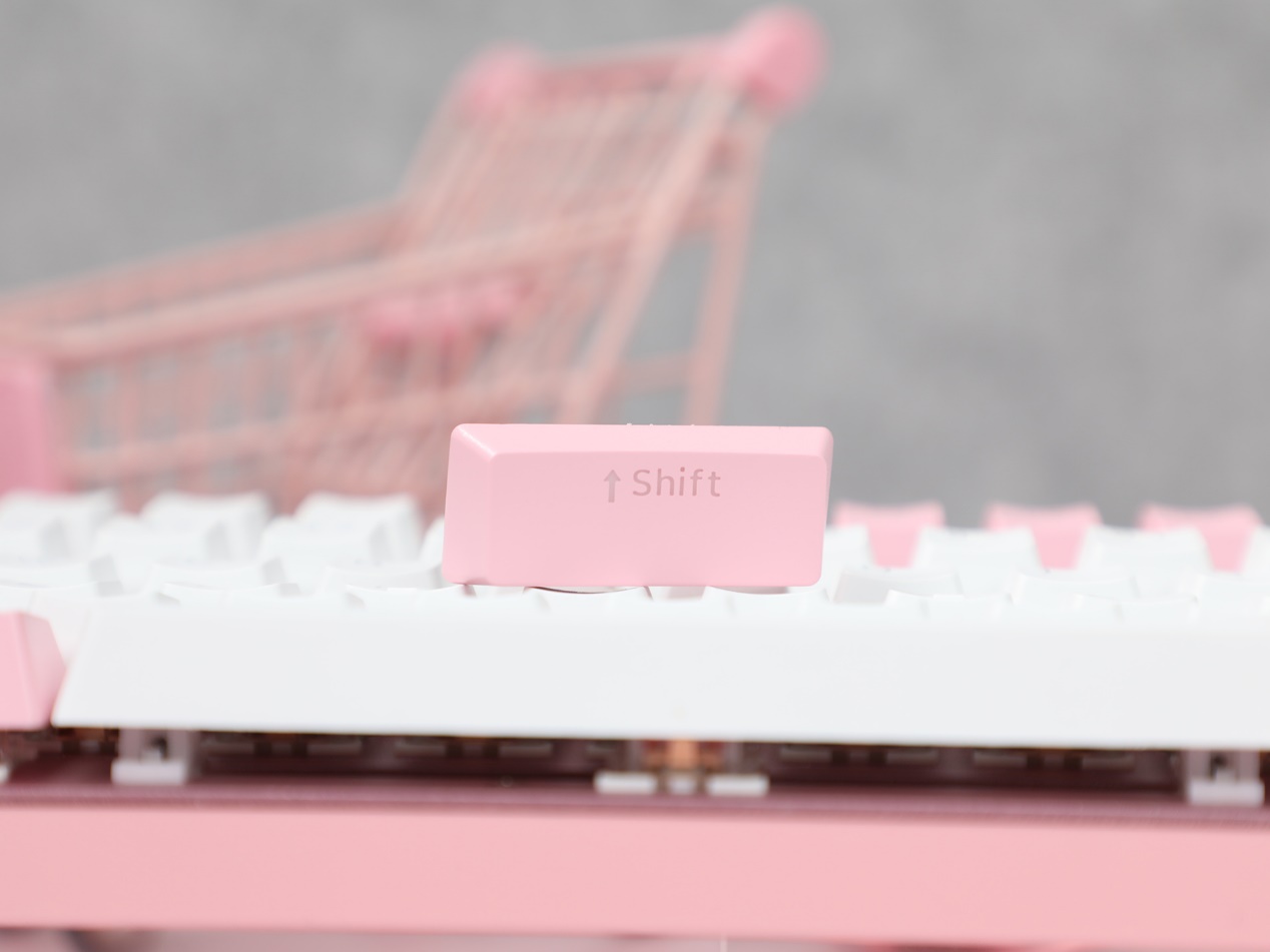 我个人非常喜欢白粉撞色的这款键盘,这款键盘外观抢眼靓丽,同时透光的键帽,实际点亮之后,效果更好。