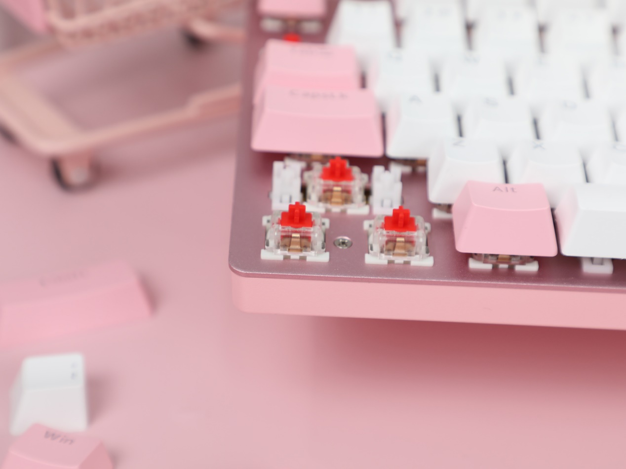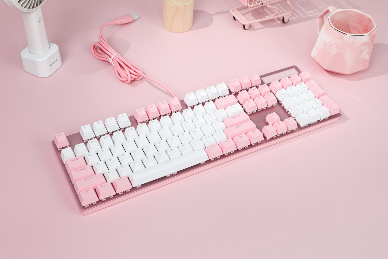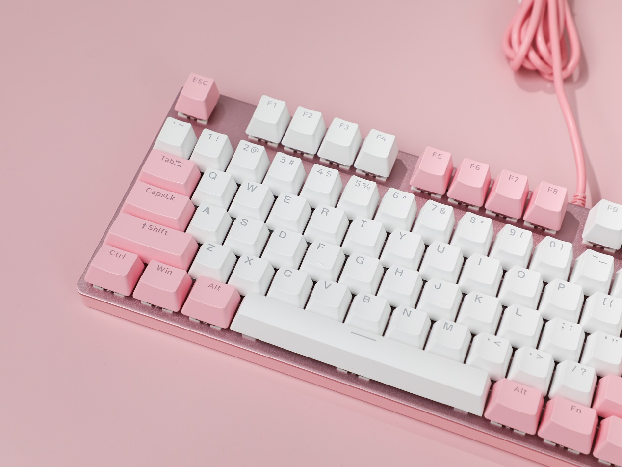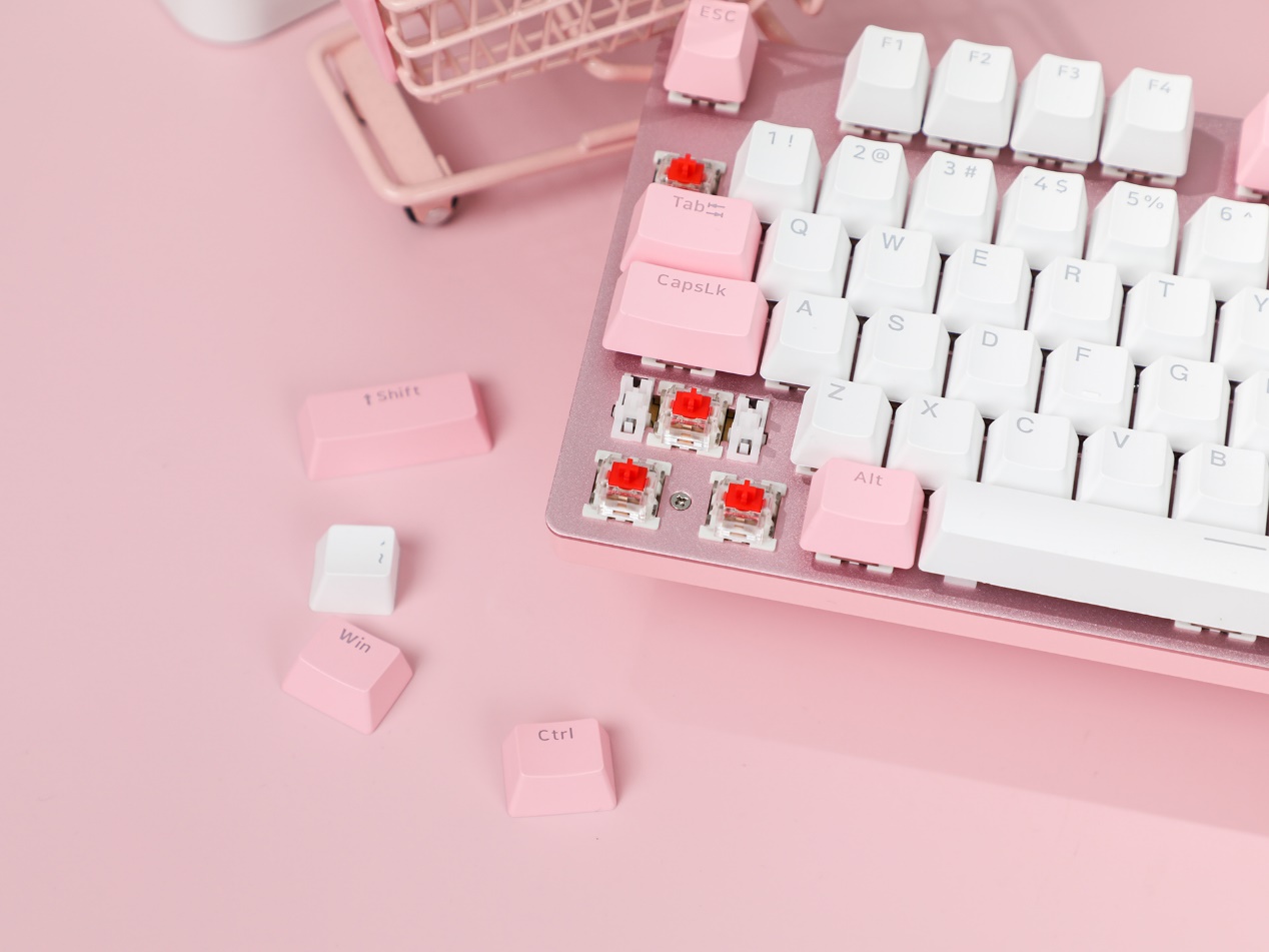 我个人非常喜欢白粉撞色的这款键盘,这款键盘外观抢眼靓丽,同时透光的键帽,实际点亮之后,效果更好。